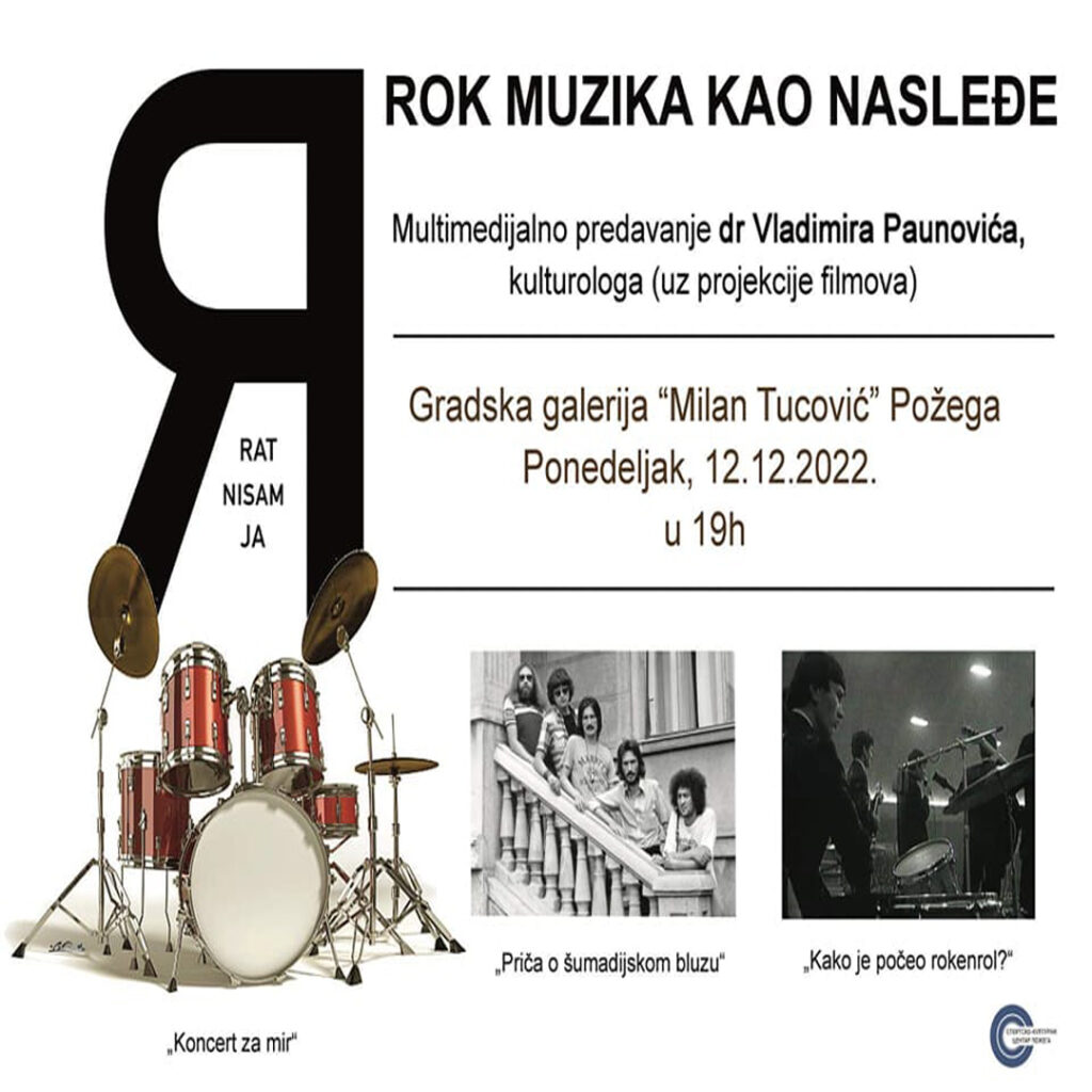 U Gradskoj galeriji „Milan Tucović“ u Požegi, u ponedeljak 12. decembra biće održano multimedijalno predavanje pod nazivom „Rok muzika kao nasleđe“. O ovoj temi će uz projekcije filmova govoriti kulturolog Vladimir Paunović. Program će početi u 19 časova, a posetioci će u okviru predavanja imati priliku da pogledaju filmove „Koncert za mir“, „Priča o šumadijskom […]