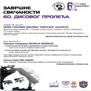 Завршне свечаности 60. Дисовог пролећа одржаће се данас и сутра у Градској библиотеци „Владислав Петковић Дис”.