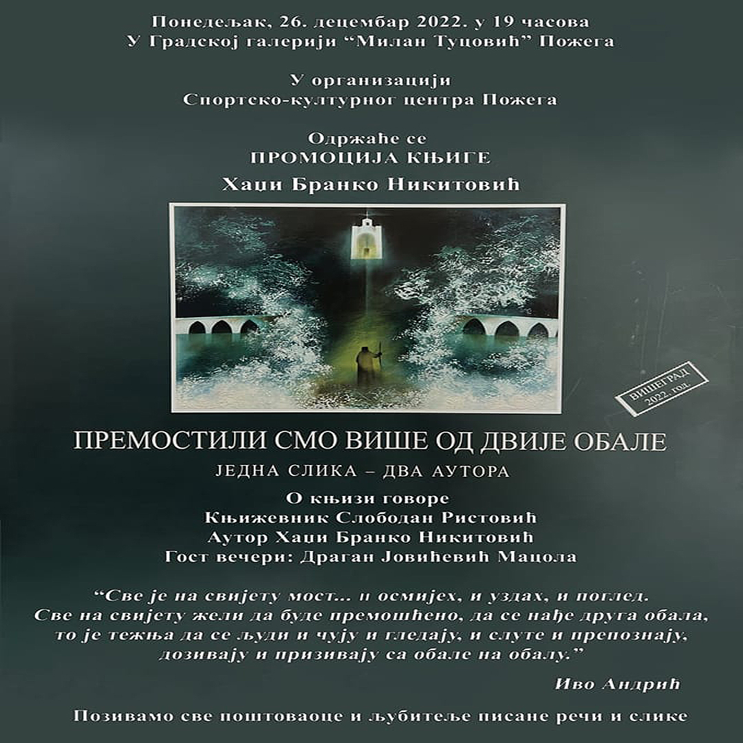 U Gradskoj galeriji „Milan Tucović“ u Požegi večeras će biti predstavljena knjiga „Premostili smo više od dvije obale”, autora Hadži Branka Nikitovića.