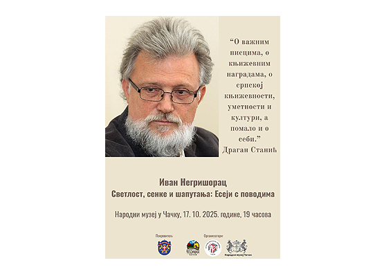 У организацији Центра за неговање традиције и Културно просветне заједнице Чачак, сутра ће у Народном музеју у Чачку бити одржано предавање под називом „Светлост, сенке и шапутања: Есеји с поводима”.