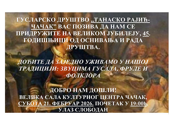 Гусларско друштво „Танаско Рајић” Чачак организује традиционално гусларско вече поводом обележавања 45 година од оснивања и успешног рада друштва.